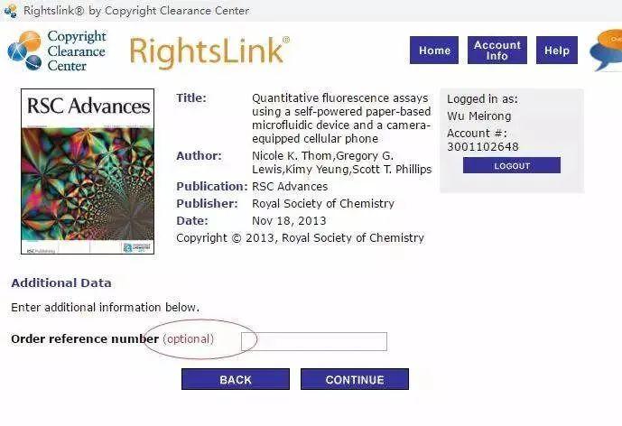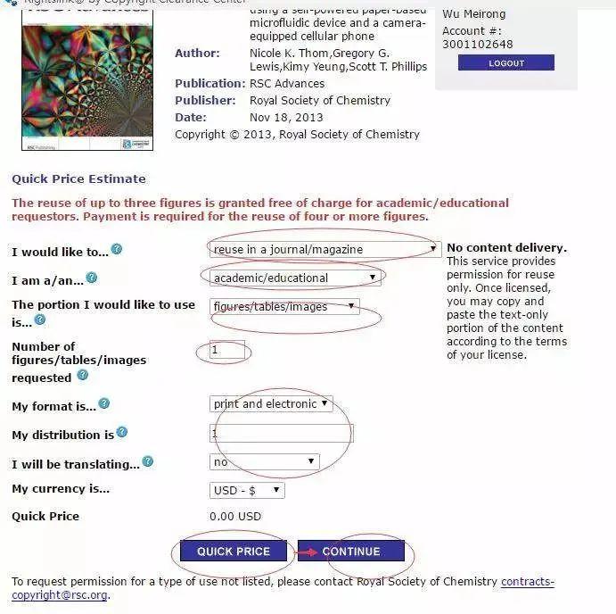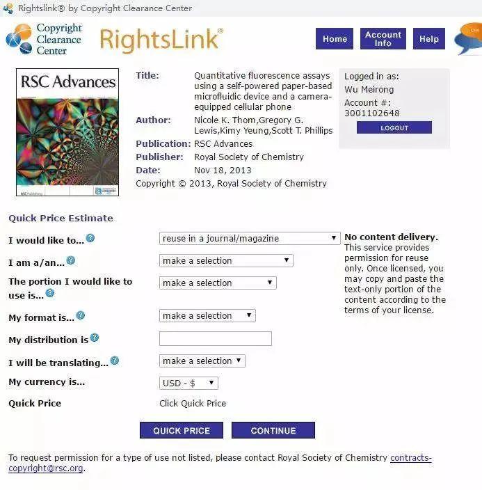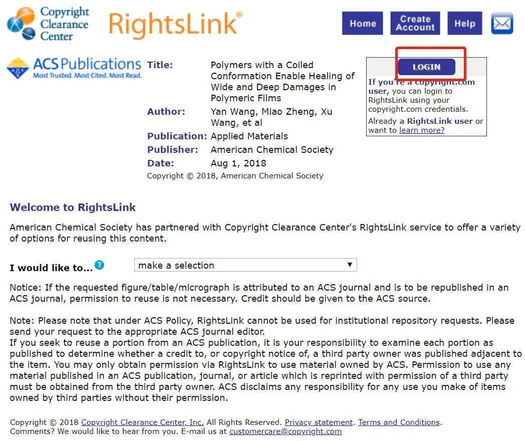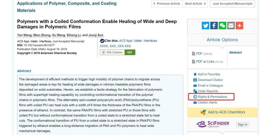 这是比较常规的,如果没有RightsLink按钮,就可以找到与版权申请的相关按钮,有 permission 或者 Contact me 等字样。然后下载版权申请模板,按照要求填写,发邮件。邮件中注明想申请版权的文章信息(比如:期刊号、页码、文章标题等),以及将会用在自己的某文章中(注明文章标题等,如果有确定的发表期刊,也可以尽可能将期刊信息列举出来)。跟上面的RightsLink填写的信息差不多。然后等待回信,把回信保存下来,以便后续证明材料的填写。