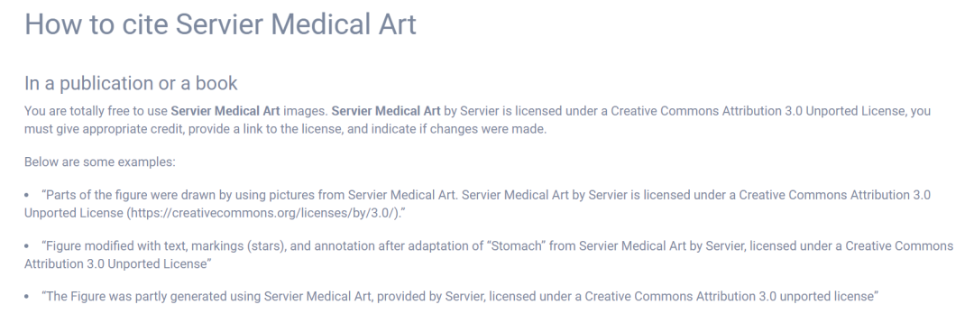 而大部分作者所下载的免费素材一般都来源于Servier Medical Art(SMART)素材库,这里尤其要跟各位强调的是:SMART素材库中的素材并不是CC0协议素材,而是CC BY素材,也就是说我们可以使用甚至修改二次创作,但必须在论文的论文的Acknowlegement中对原创作者进行署名,提供许可协议链接,同时标注哪些地方进行了修改。具体的说明模板我们可以参考下图中的示例来进行描述: