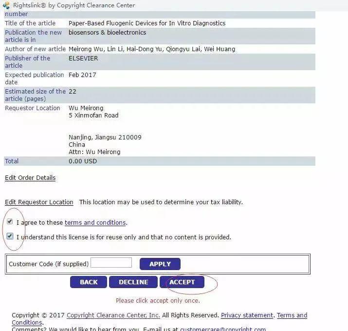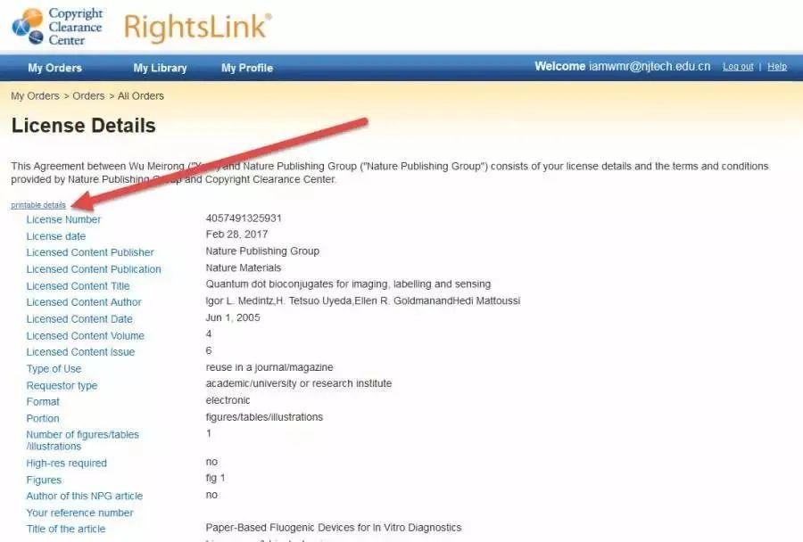 至此,你注册 RightsLink 的账号时用的邮箱中,会收到确认邮件。接下来耐心等待数个工作日即可。一切完成后,会收到邮件通知。