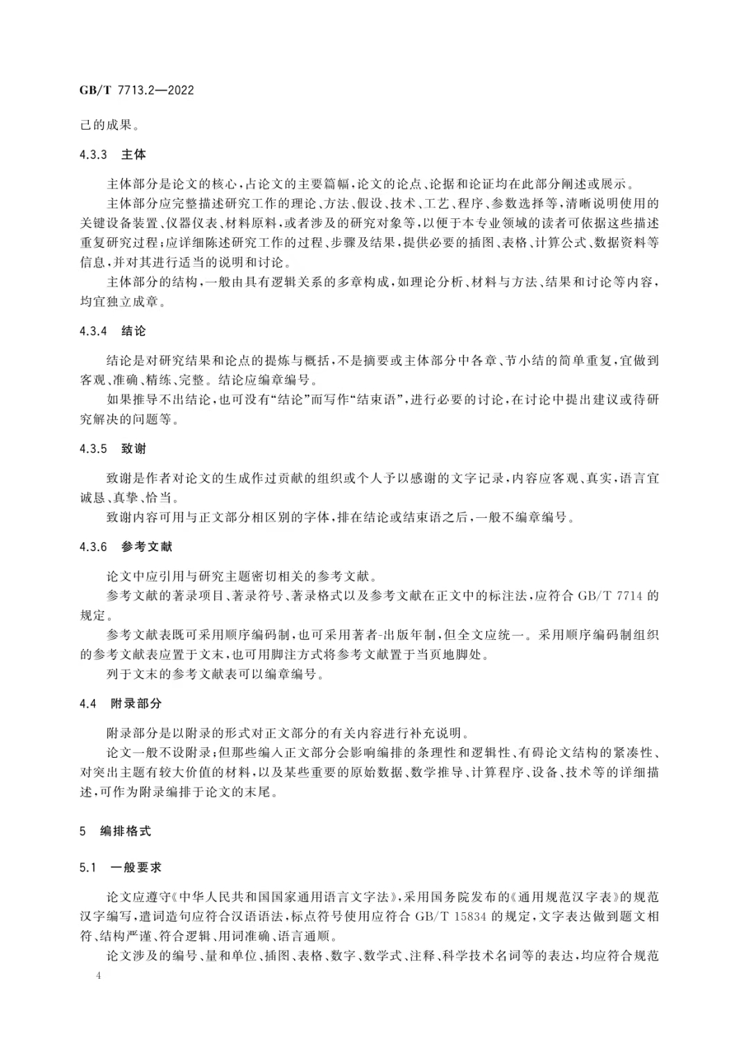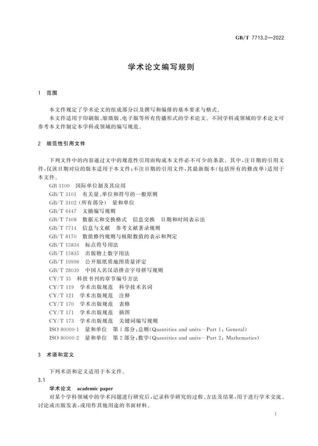 新发布的国家标准《学术论文编写规则》(GB/T 7713.2-2022)描述了撰写和编排学术论文的基本要求和格式规范。该国标适用于包括一切反映自然、社会和人文等的科学体系的学术论文。学术论文编写的标准化和规范化,是使其格式和体例规范化,语言、文字和符号规范化,技术和计量单位标准化,以便于学术论文的检索和传播,促进学术成果的交流和使用。