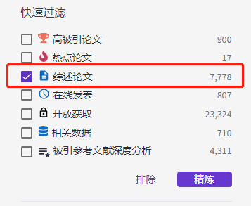 我们该如何从这70,098篇文献中找到综述呢?点击左侧快速过滤中的“综述论文”选项即可。