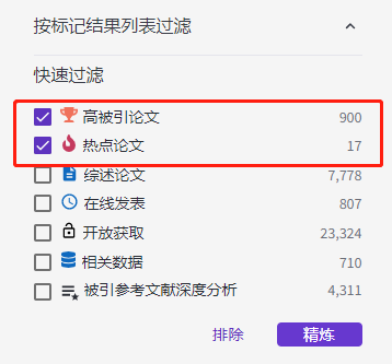 同样,查找高被引论文和热点论文,也可以采用此方法筛选。