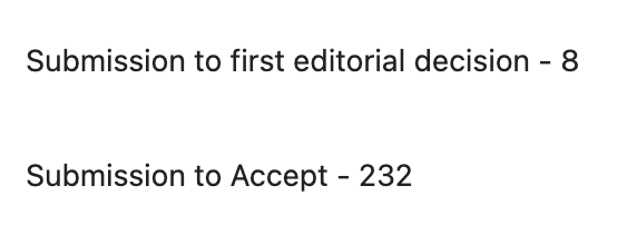 期刊官网宣称从投稿到第一次编辑决定的时间大约在8天左右,从投稿到文章被接受大约时间在232天左右。