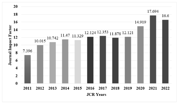 Nature Communications2011年收获第一个影响因子(JCR 2010)7.396,随后影响因子整体上呈上升趋势,最新影响因子(JCR 2022)为16.6,较JCR 2022的17.694略有下降。在JCR所收录的76本综合性期刊中排名第6,处JCR Q1区。中科院分区为大小类均位于1区的Top期刊。