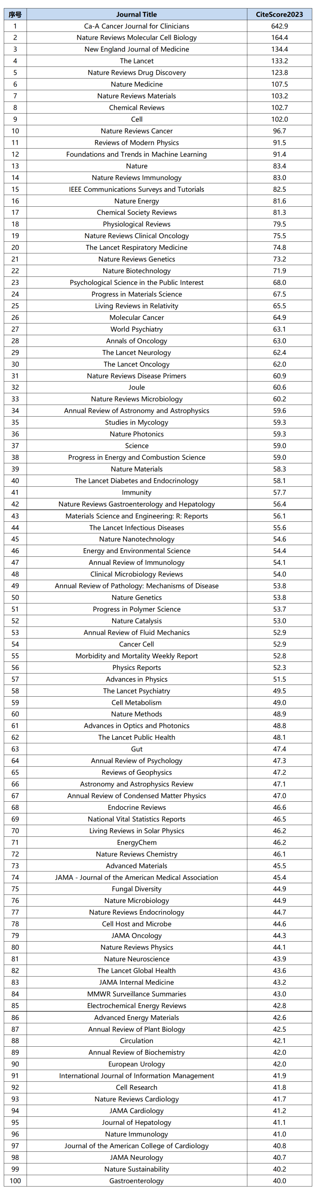 位列第一的CA-A CANCER JOURNAL FOR CLINICIANS的2021影响因子为286.13,根据公式,预测它的最新IF为330.5,而这与CiteScore公布的642.9想去甚远,可见这两个评价指标差异之大。