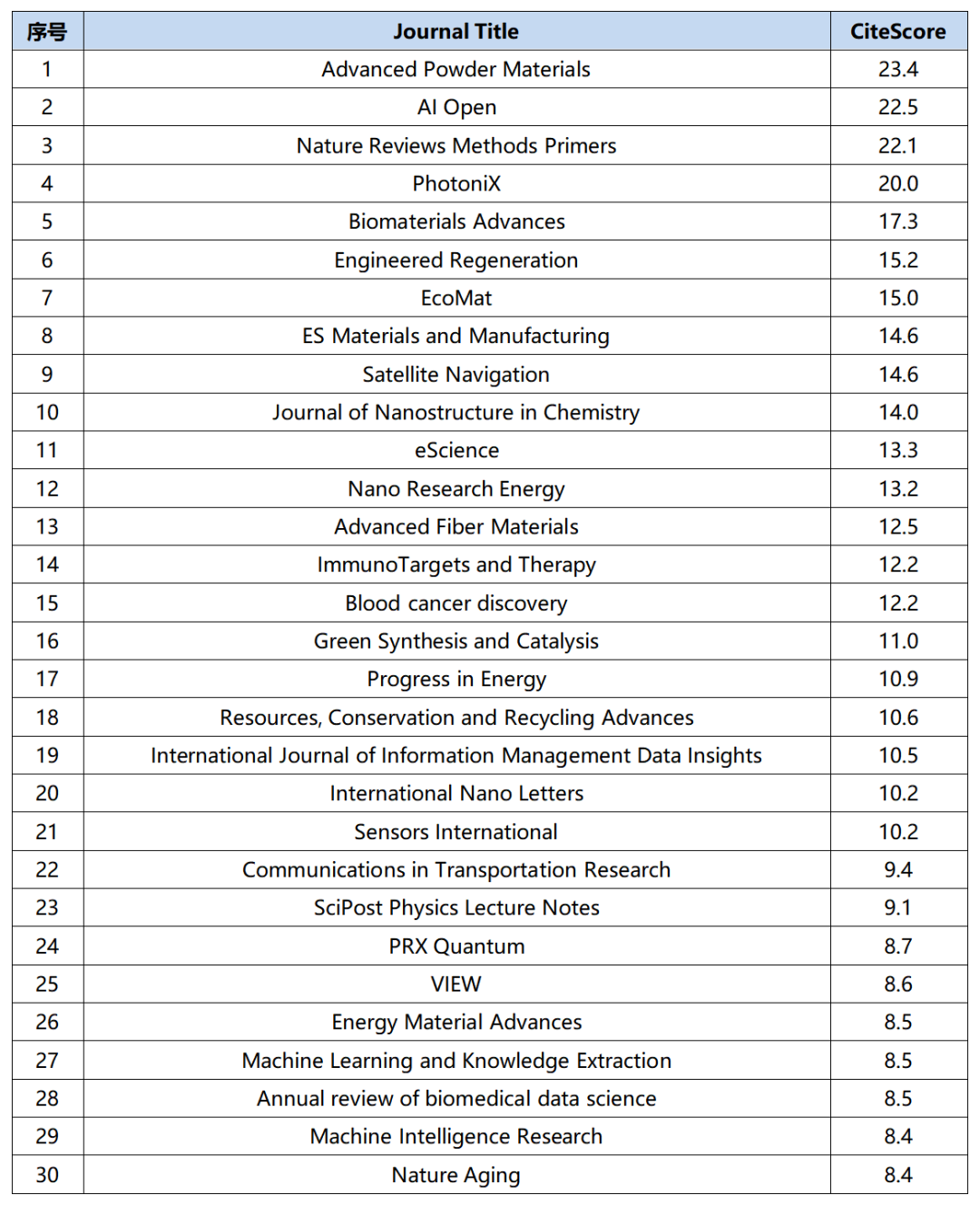 今年有1522个期刊收获了它们的第一个CiteScore引用分,下表为根据引用分数排序的前30名新晋期刊。