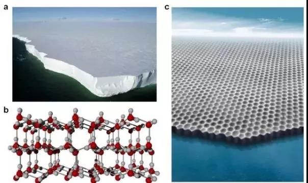 b:自然界最常见冰相(Ice Ih)的分子模型